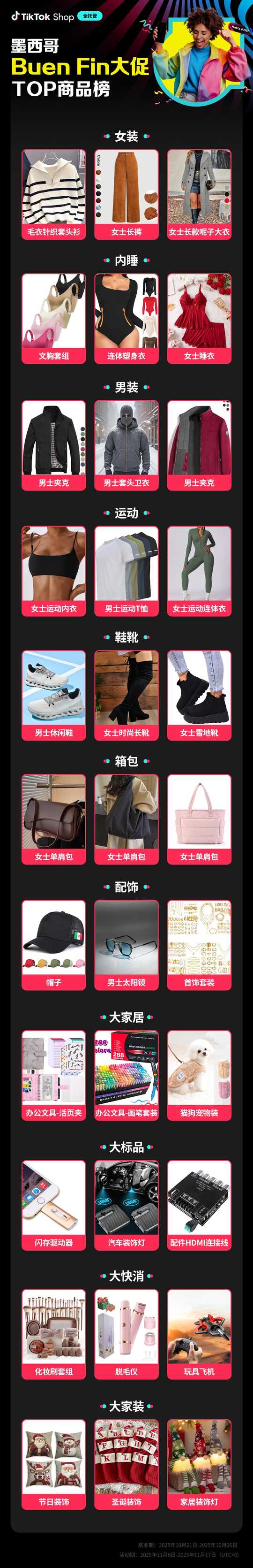 本次墨西哥Buen Fin大促中阐扬格外的TOP商品榜单,粉饰女装、内睡、男装、通顺、鞋靴、箱包、配饰等热点品类,连合反应了圣诞节日主题特点居品、秋冬爆款好物等大促重心商品标的的茂盛需求。