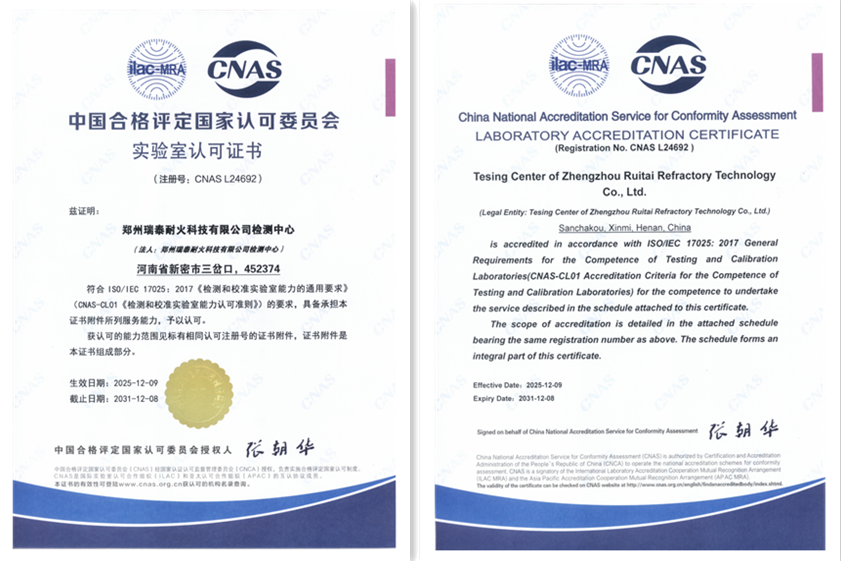近日,郑州瑞泰耐火科技有限公司检测中心通过中国及格评定国度认同委员会严格评审,取得国度级实验室认同文凭,文凭注册号CNAS L24692。这符号着郑州瑞泰时刻处分水平与实验检测才智已达到国度及海外圭表化体系条目,其出具的检测证实将取得巨匠数十个互认国度的承认,在公信力与泰斗性上迈上了全新台阶。